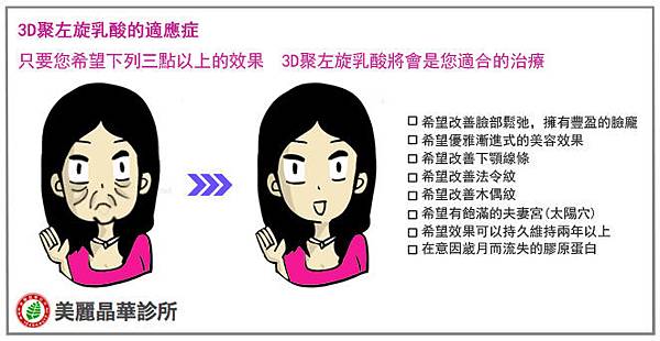不論是皺紋、凹陷、或者鬆弛下垂都非常適合用3D聚左旋乳酸來治療,