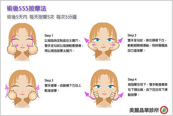 請記得「555」的口訣!!術後5天,每天按摩五次,每次五分鐘!